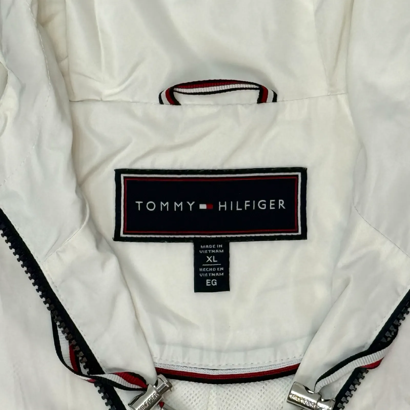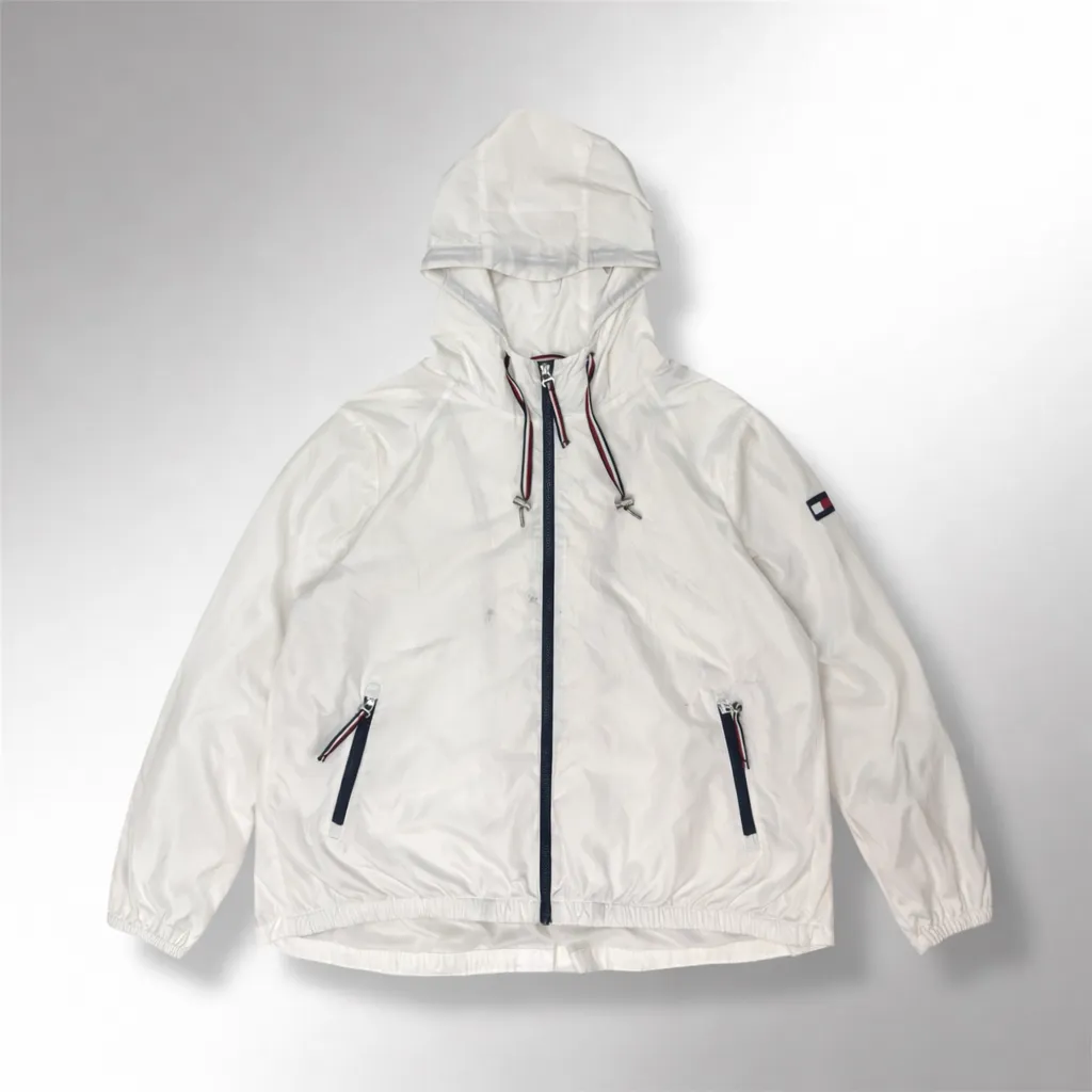 Size on tag: XL ? Actual Size: L to XL ? Dimension: 25×26 ? Description: Vintage Tommy Hilfiger White Hooded Windbreaker Jacket ? Condition: Stain (Washable)