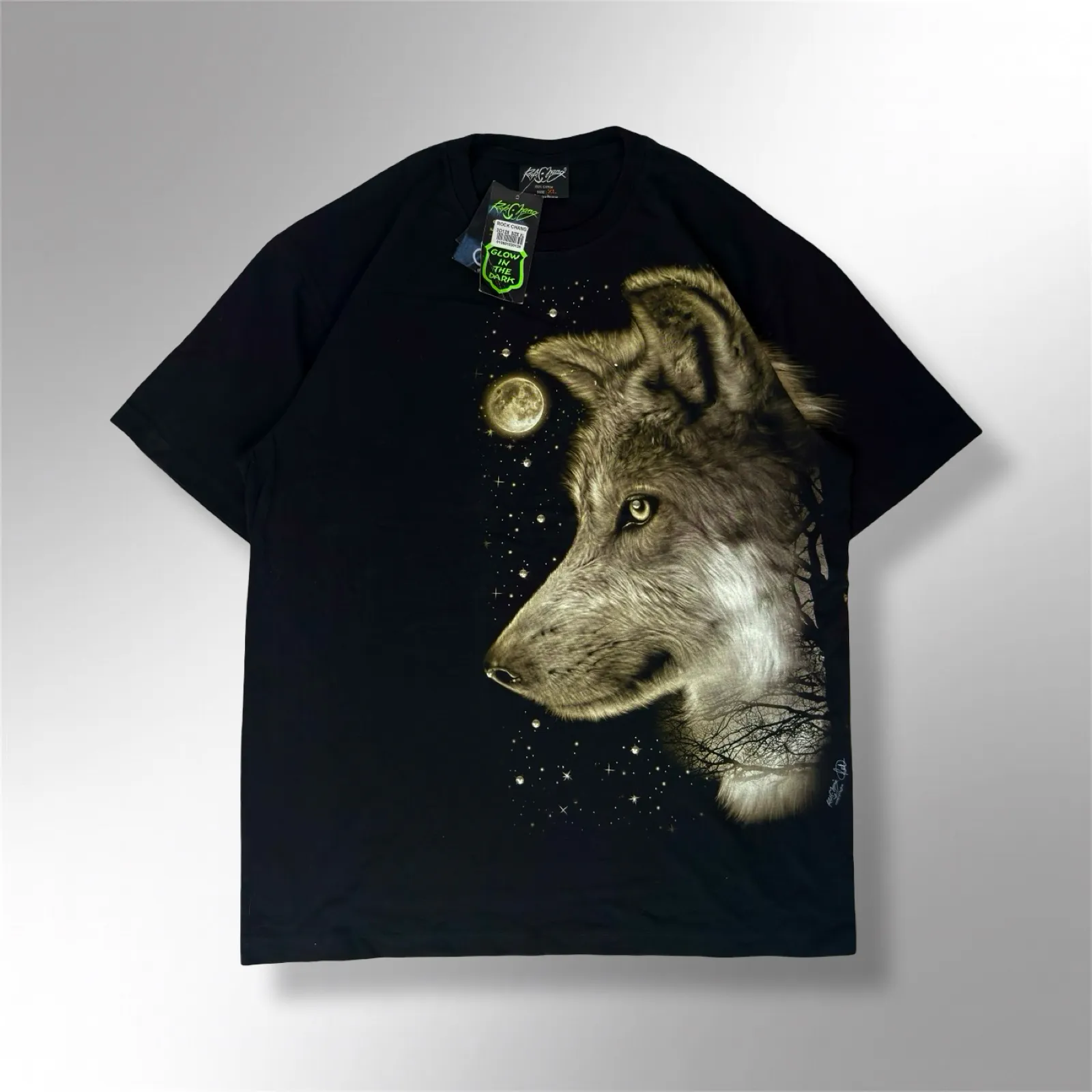 Maintained in excellent condition, the fabric remains soft, and the graphic retains its vibrant detail and glow effect. Ideal for Rock Chang collectors, alternative fashion lovers, and fans of bold graphic tees, this Wolf Moon Starry Night GID T-Shirt is a standout piece that blends art, rarity, and streetwear culture seamlessly.