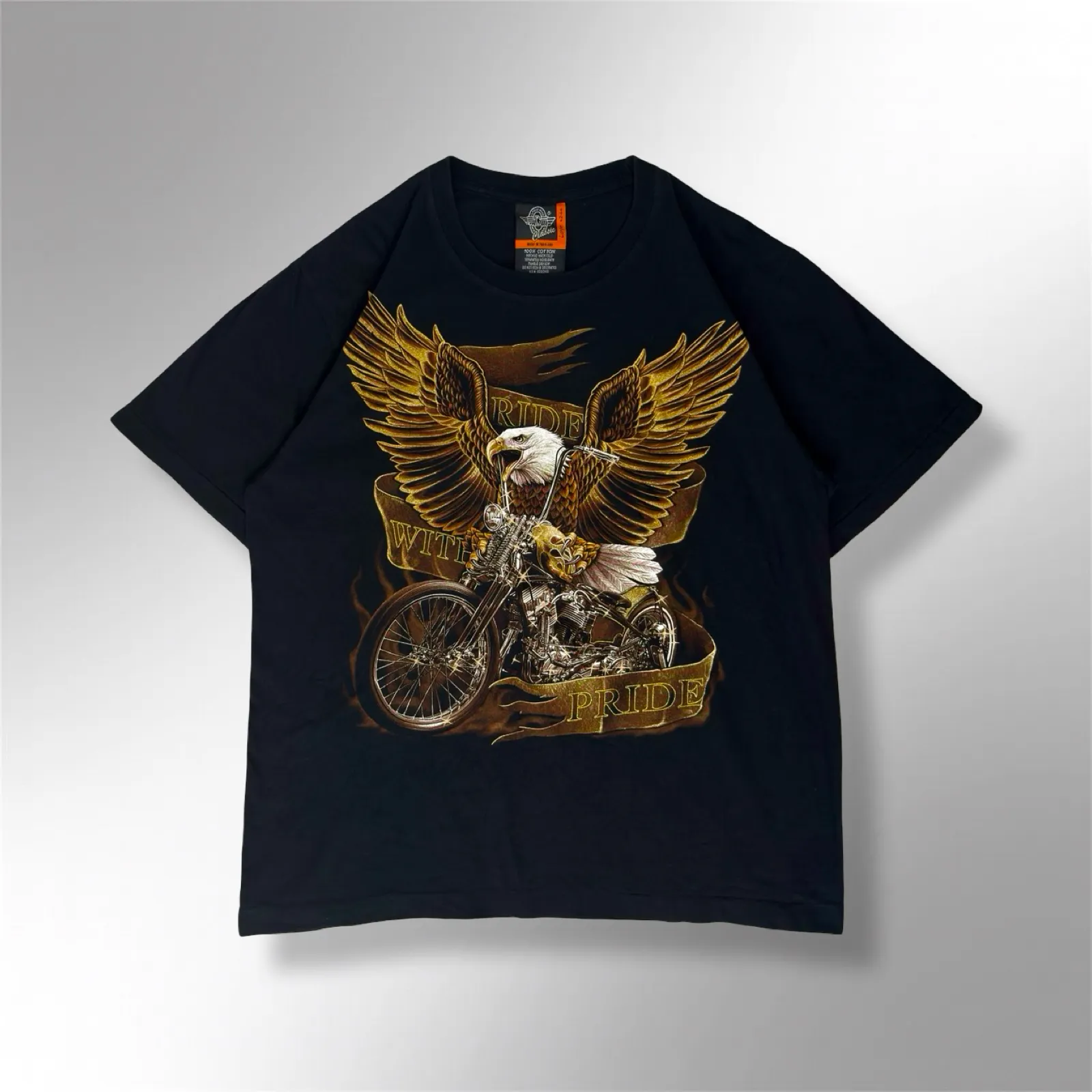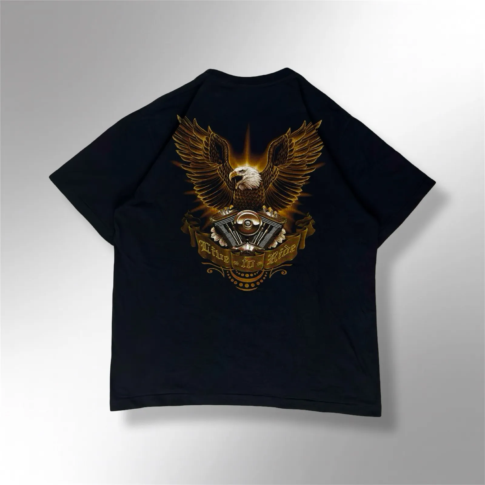 This authentic Rock Eagle “Live to Ride” T-Shirt is a premium biker-inspired t-shirt designed for motorcycle enthusiasts, streetwear fans, and vintage graphic tee collectors. Featuring a striking golden eagle graphic with glitter accents, the t-shirt embodies freedom, adventure, and bold self-expression associated with biker culture. Crafted from high-quality cotton fabric, it offers superior comfort, breathability, and durability, making it ideal for everyday wear, long rides, or as a collectible piece.